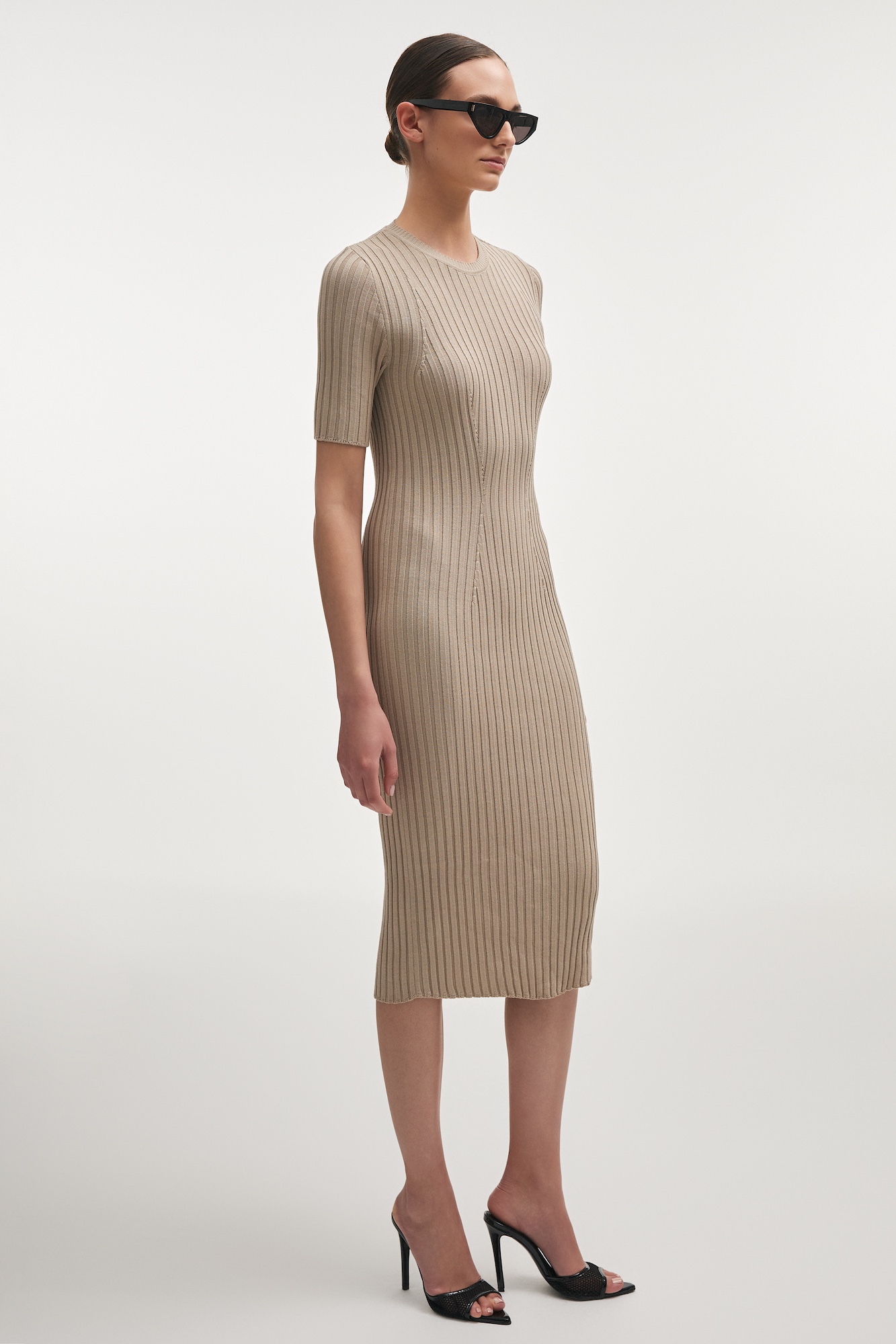 A sculpted ribbed knit dress designed to trace the body’s natural silhouette. Crafted from a soft viscose blend, it offers a close-fitting, elongated shape that balances structure with fluid movement. The clean, minimal front is contrasted by a striking open-back detail, introducing a refined sense of sensuality. Short sleeves and a simple neckline maintain a polished, modern finish.