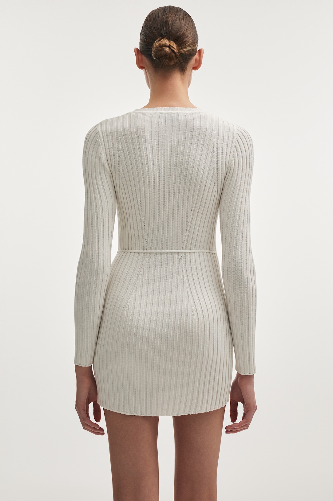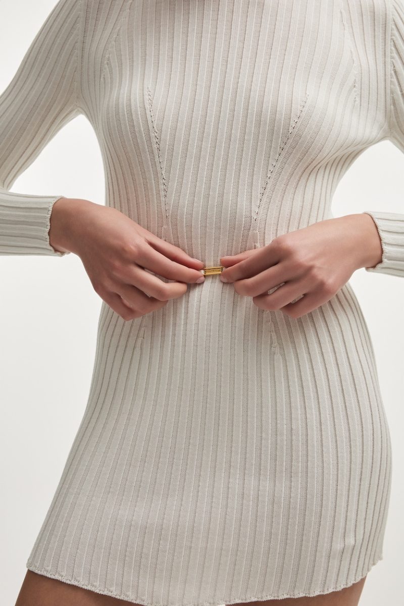 Clean lines, a simple neckline, and long sleeves let the ribbed texture define the shape, creating a modern, understated femininity.