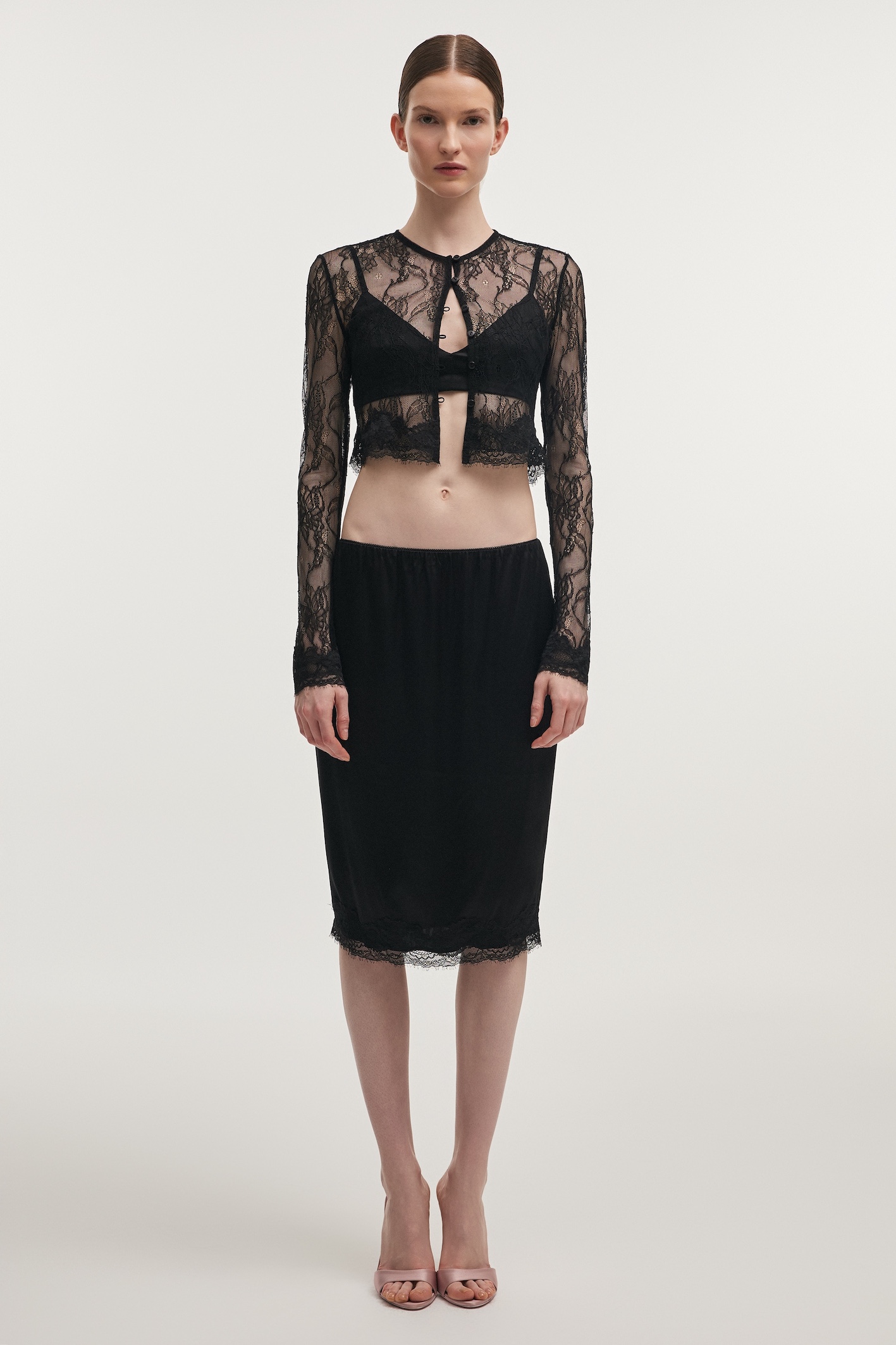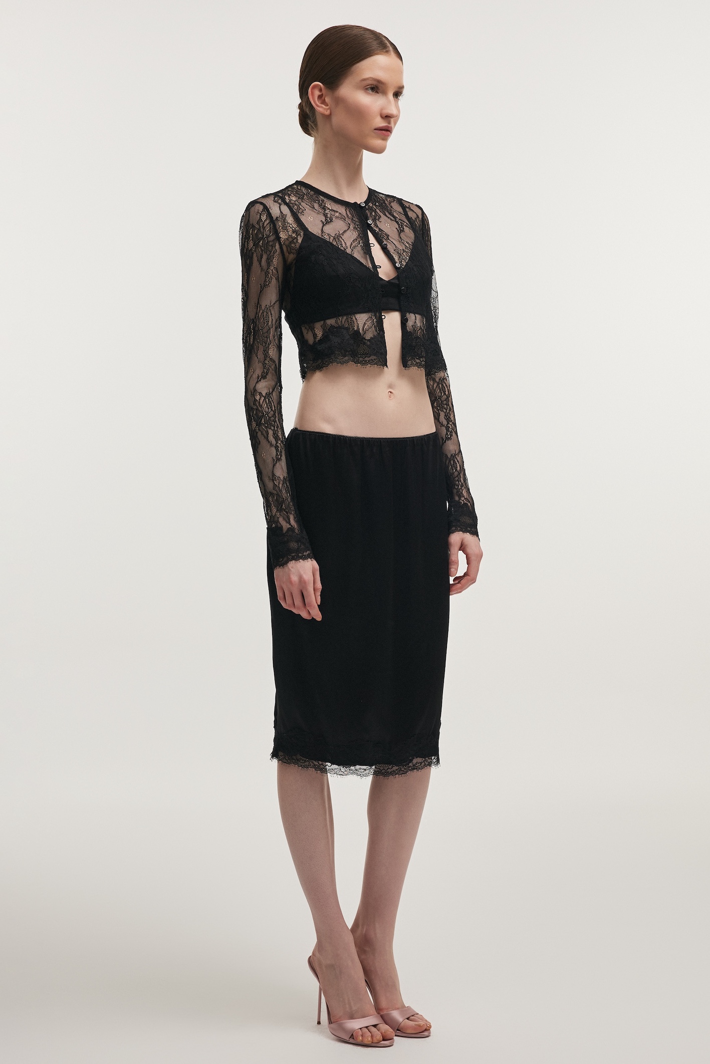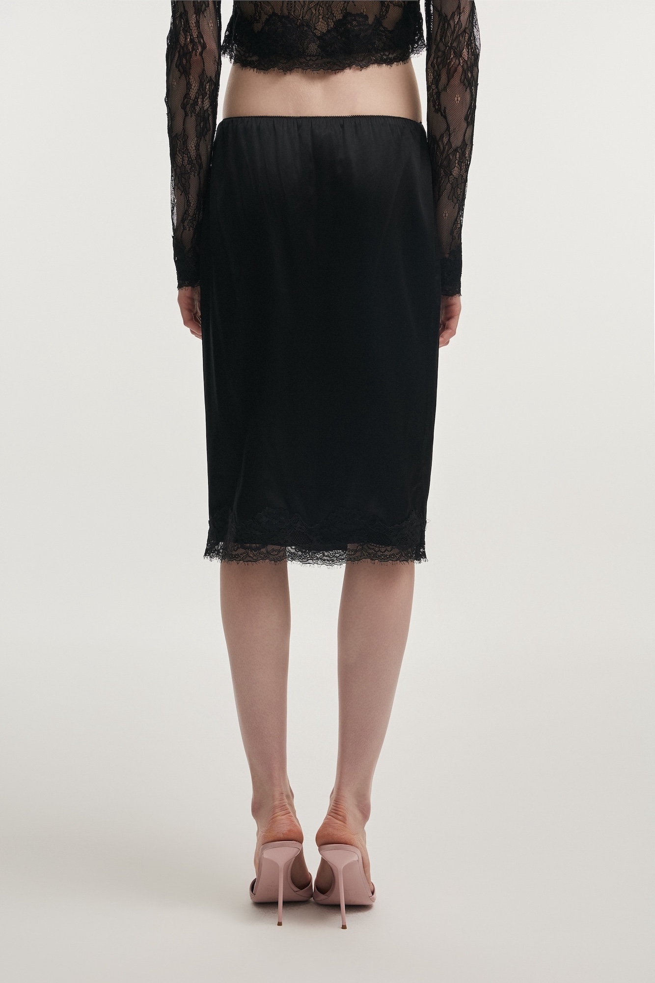 A refined silk satin midi skirt, crafted to follow the body with fluid elegance. Made from a soft silk blend, it creates a sleek, elongated silhouette, while a subtle lace trim at the hem adds a hint of sensuality without overpowering the modern, minimal design. The smooth, flowing fabric enhances natural movement, balancing sophistication with effortless ease.