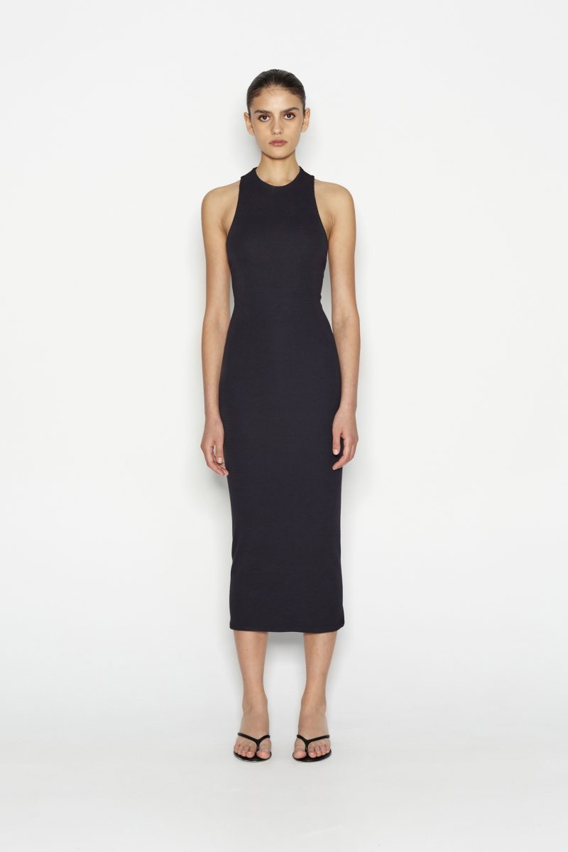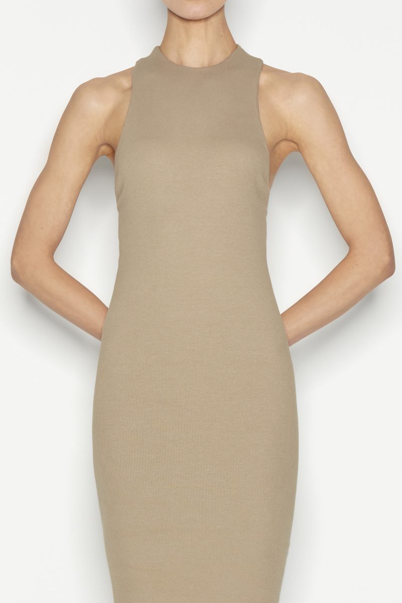 The Oasis dress is a sleeveless maxi dress designed for everyday. Crafted from soft, ribbed fabric, it features a high round neckline for a sophisticated front, while the bold racer-back design and deep side cutouts bring a daring, modern touch. The relaxed fit and flowing silhouette make it perfect for any occasion, whether casual or dressy. Pair it with sneakers for a laid-back daytime look or dress it up with kitten heels and accessories for an evening outfit.