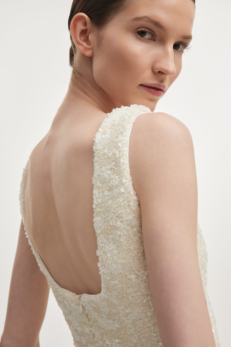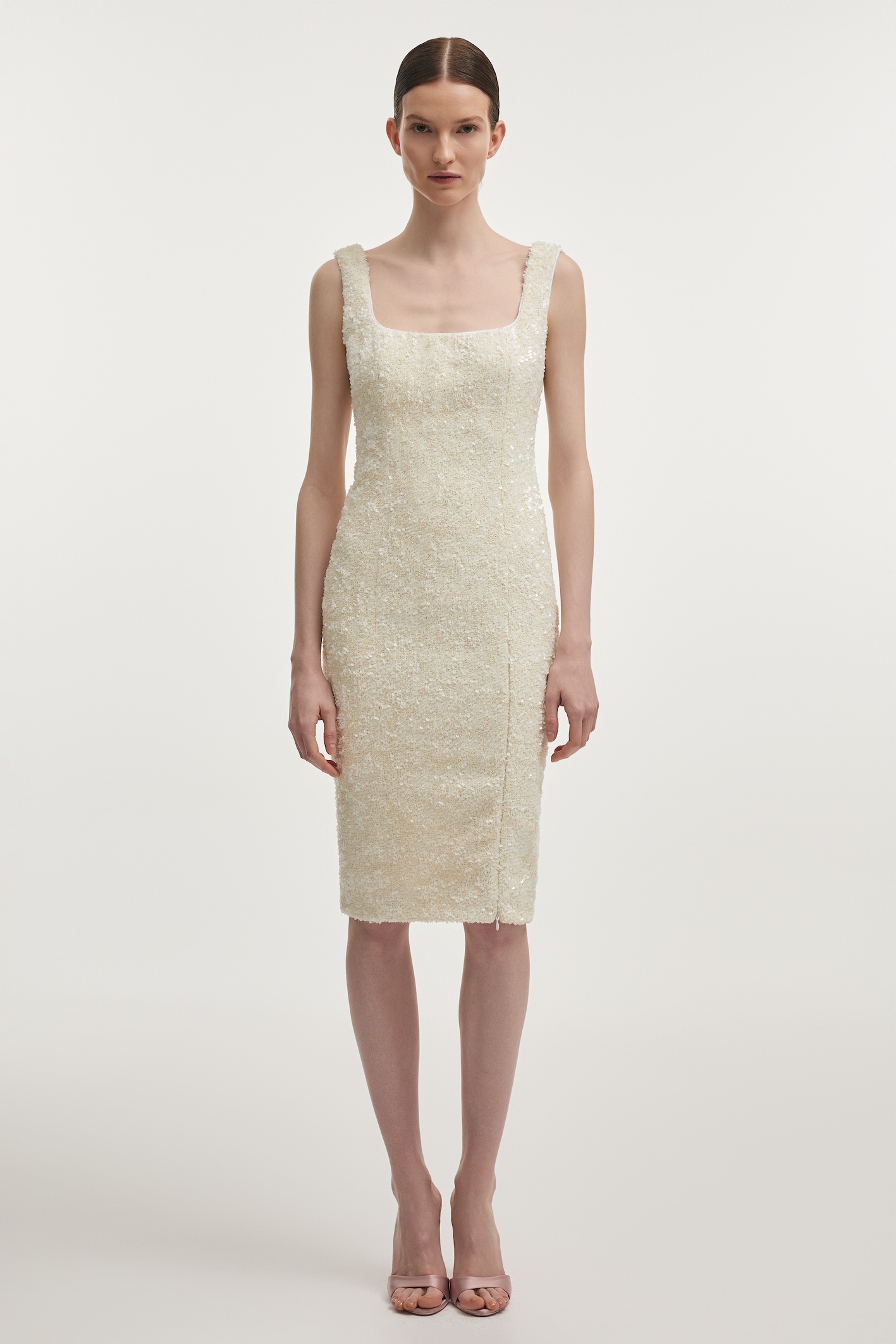 A perfect blend of luminosity and structure, the Petra Dress is crafted from sequin tweed that gracefully contours the silhouette. Its clean, sculpted lines are accented by delicate straps and a defined neckline, creating a composed and confident shape.