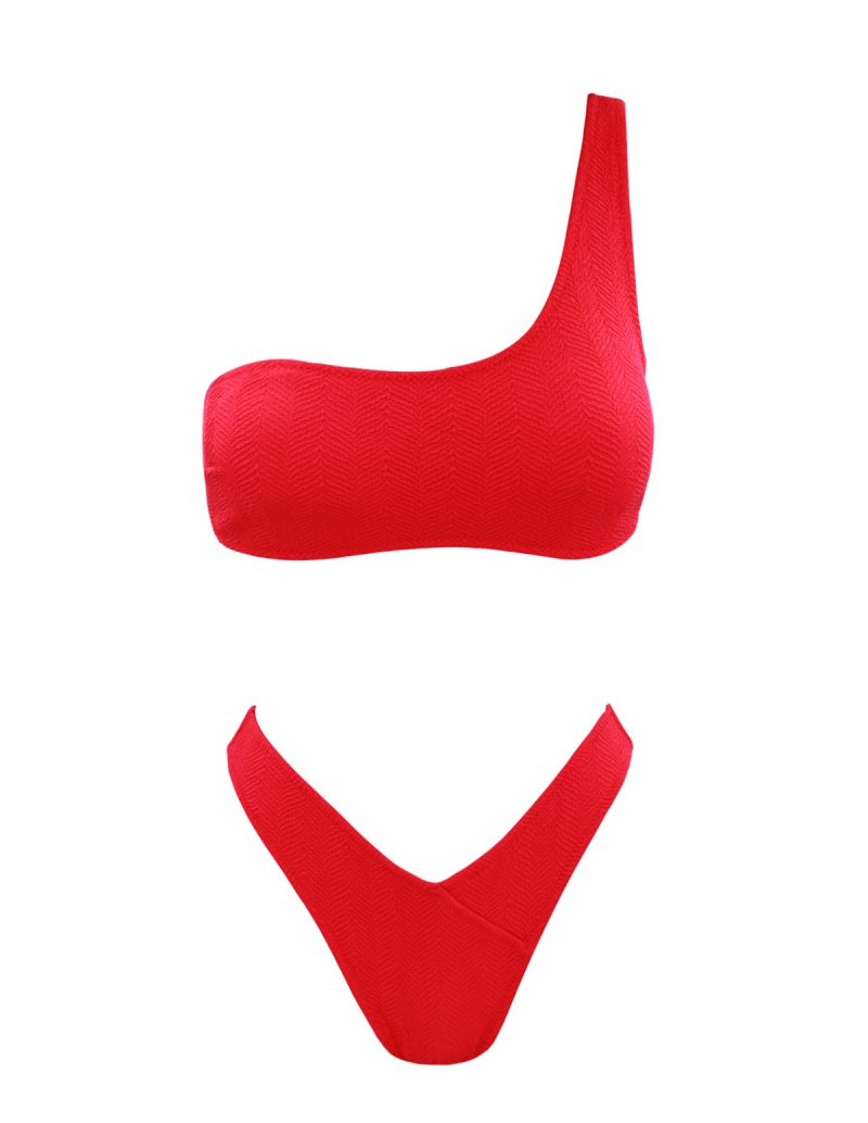 Bikini top with one shoulder strap and back hook closure and high rise bikini bottom.