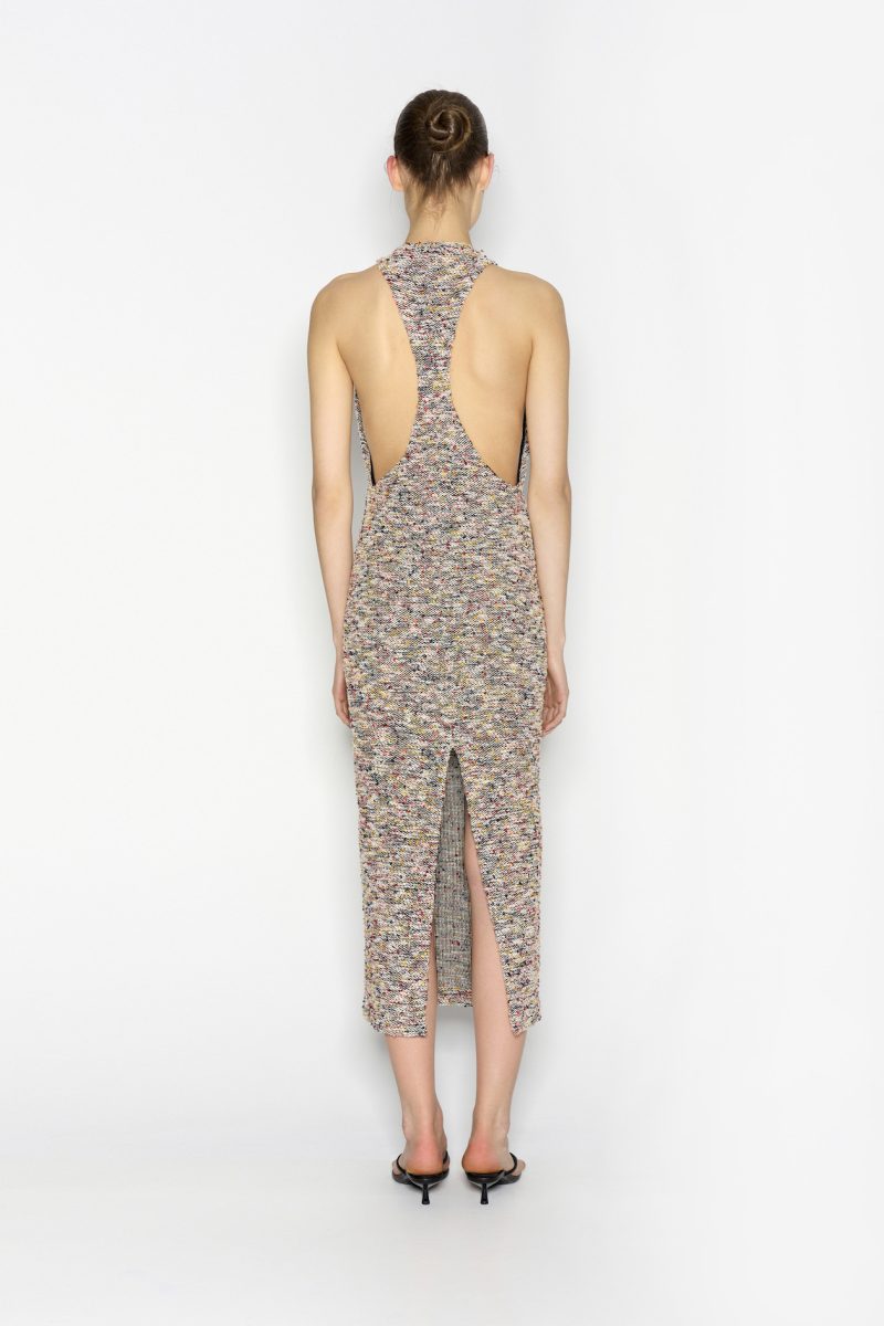 this dress features a high neckline and an eye-catching racer-back design for a bold statement.