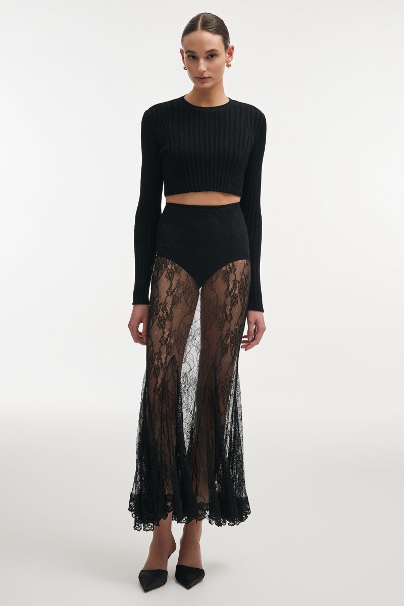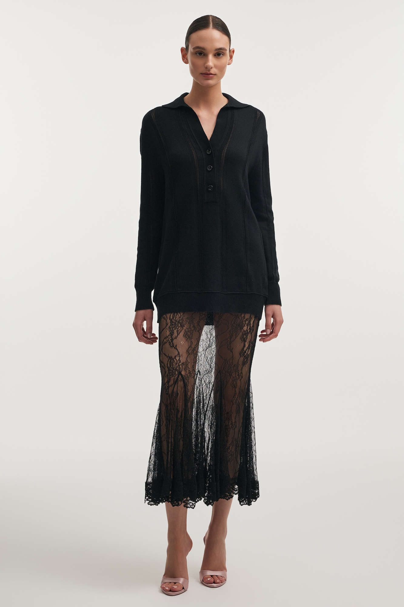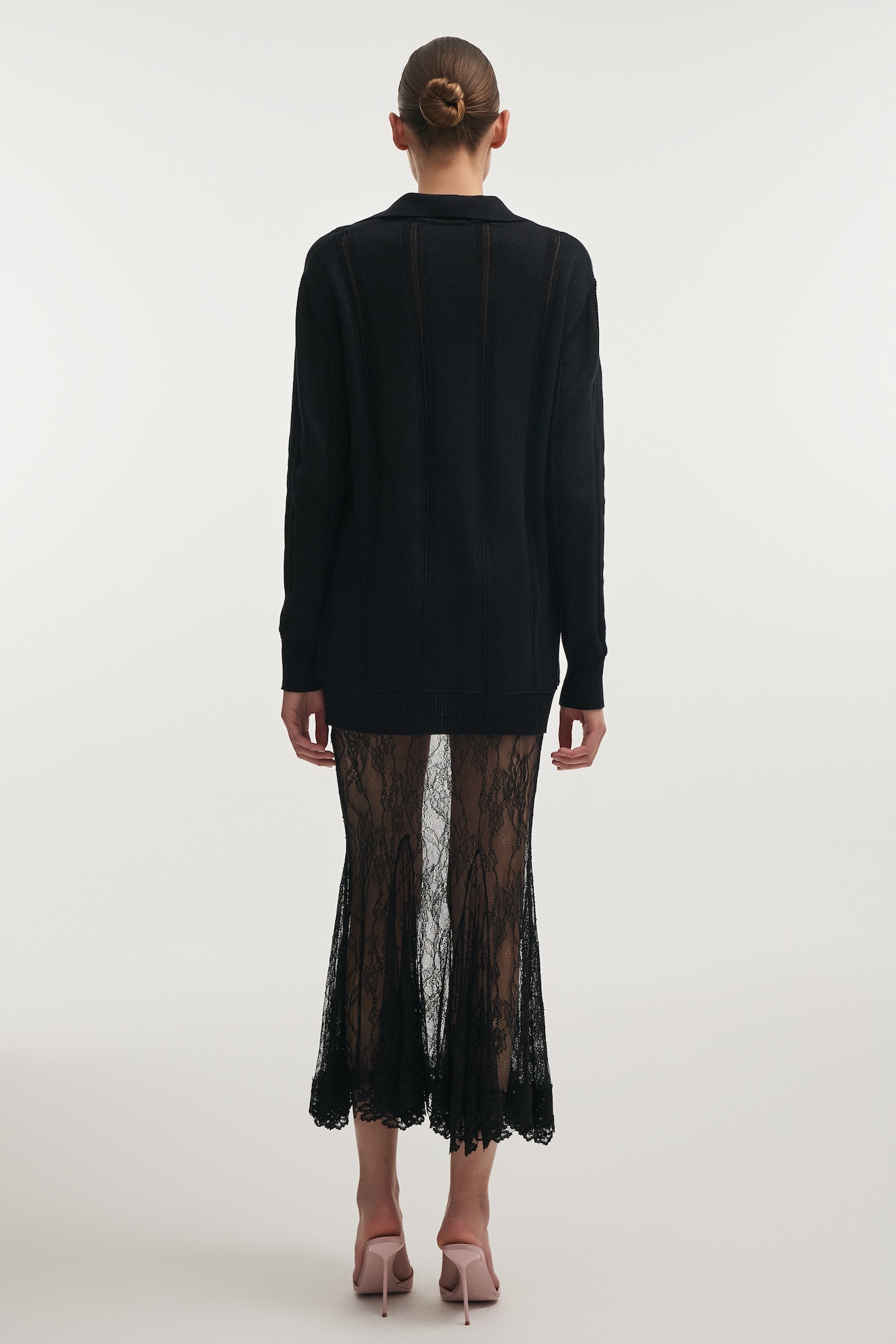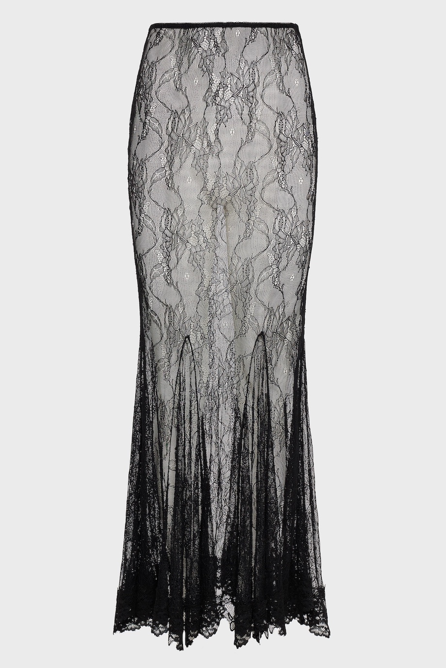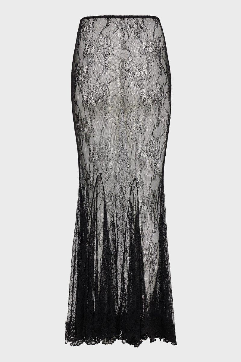 A sophisticated lace skirt designed to balance softness with a sleek, elongated shape. Cut from delicate lace, it gently contours the body before opening into a subtle flare at the hem, adding graceful movement. The semi-sheer finish brings a touch of understated allure, while the clean waistband keeps the silhouette refined and modern. The fluid drape highlights the contrast between structure and transparency.