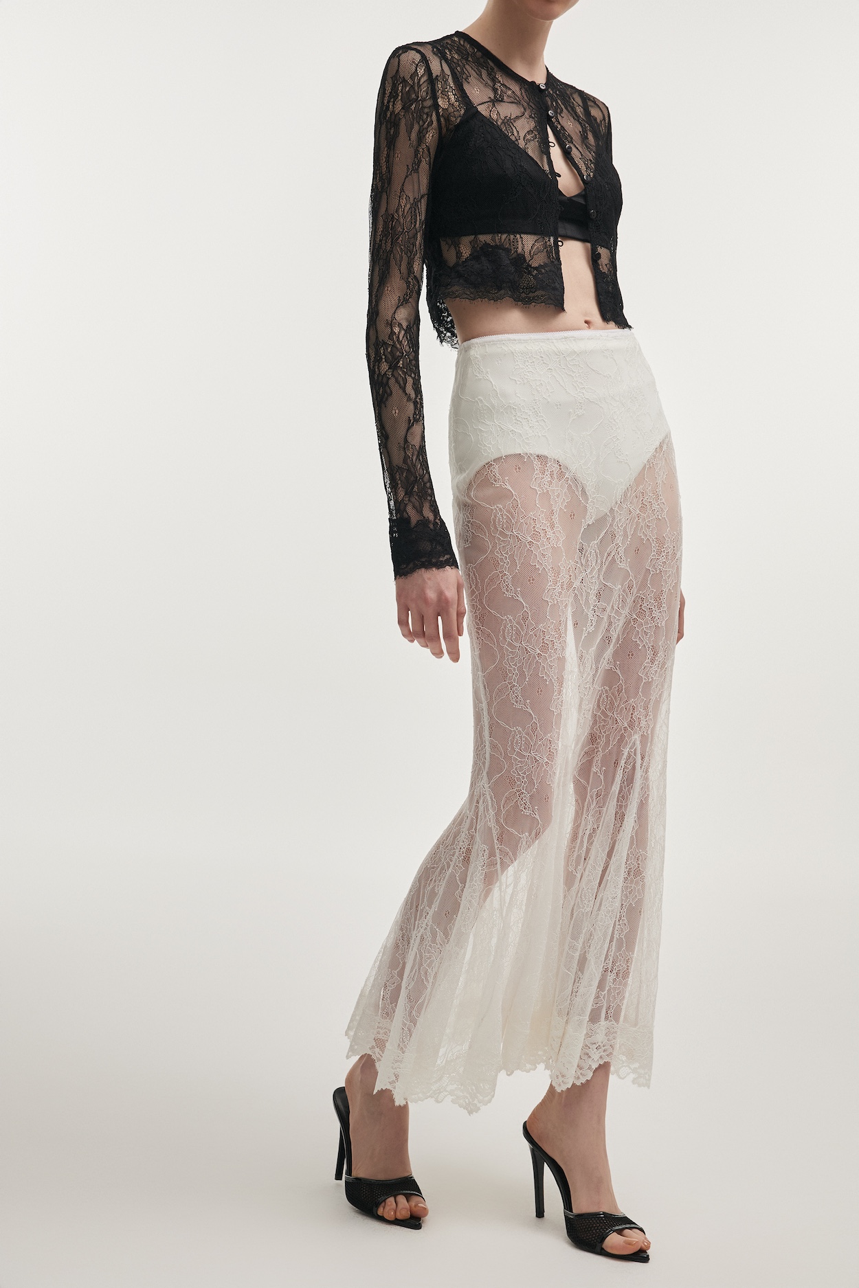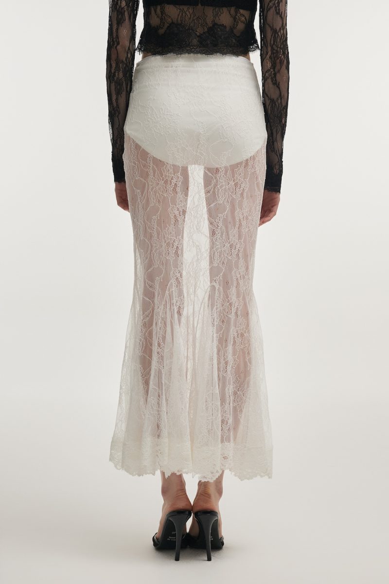 A sophisticated lace skirt designed to balance softness with a sleek, elongated shape. Cut from delicate lace, it gently contours the body before opening into a subtle flare at the hem, adding graceful movement. The semi-sheer finish brings a touch of understated allure, while the clean waistband keeps the silhouette refined and modern. The fluid drape highlights the contrast between structure and transparency.